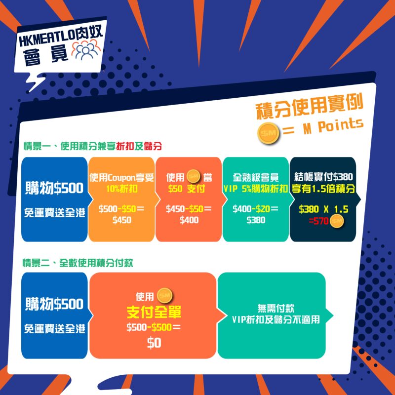 - 會員折扣是以扣減Coupon及M Points後實付金額計算(參考上圖實例一),折扣不適用於運費。