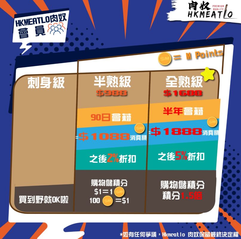 每人只可以購買一個會藉,並且不能轉讓/借用給他人。如會員提供虛假資料,HKMEATLO 有可能會終止你會員會籍。 -