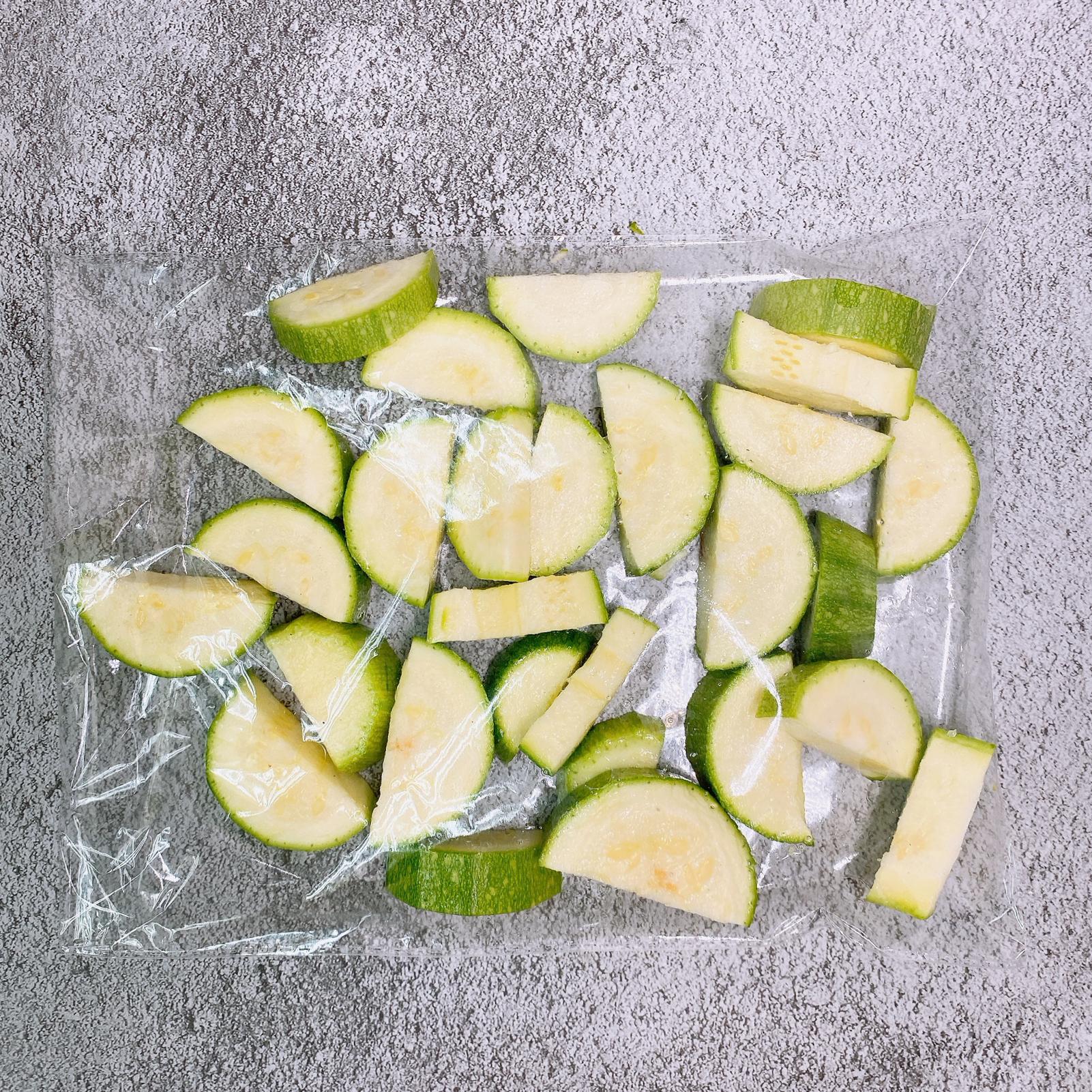 The zucchini has been washed and cut into half-moon slices, about 6-8mm thick, making it easy to cook and stir-fry!